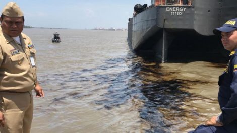 Unidades de la Capitanía de Puerto de Barranquilla trabajan en el río Magdalena en un plan para evitar que el derrame de combustible de una barcaza...