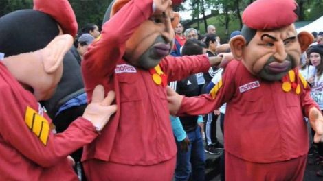 Un grupo de cuatro personas disfrazadas con botargas del ex presidente de Venezuela, Hugo Chávez, se presentaron en el arranque de campaña de...